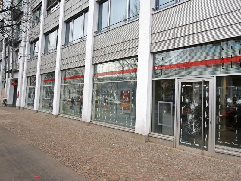 Auch die Sparkassen-Filiale am Connewitzer Kreuz zeigte am Montag deutliche Spuren der Krawalle.