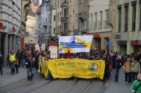 Am Fischmarkt angekommen zeigte sich die unerwartete Größe der Demo. Nur mit Mühe konnten die Straßenbahnschienen freigehalten werden. An dieser Stelle verlas die Erfurter Flüchtlingsinitiative ihren Redebeitrag, der eindringlich auf die rassistischen Polizeikontrollen in Stadt und Bahnhof hinwies. (Die Unterstützung von kämpfenden Flüchtlingen ist in Erfurt schon länger Thema.) Das Thema Rassismus wurde jedoch auch aus gesellschaftstheoretischer Perspektive aufgegriffen: Der Redebeitrag der Erfurter Gruppe der „Rassismus-tötet!“-Kampagne analysierte Rassismus im Rahmen der kapitalistischen Konstitution dieser Gesellschaft und fügte historische Betrachtungen bei. Die Antifa Arnstadt-Ilmenau verhielt sich mit ihrem Redebeitrag kritisch, aber solidarisch zur Demonstration. Sie wiesen daraufhin, dass Rassismus ein gesellschaftlich notwendiges Verhältnis sei, dem nicht durch eine Aufklärung beizukommen ist. In diesem Zusammenhang muss sich der Kreis der Vorbereitenden zu recht danach fragen lassen, mit welchem Anspruch man an diesem Tag auf die Straße gegangen ist und ob dieser sich eingelöst hat.