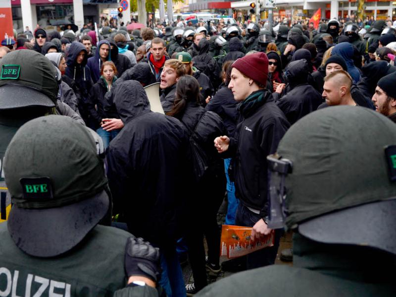 Polizeikräfte kesseln linke Gegendemonstranten ein. Foto: dpa